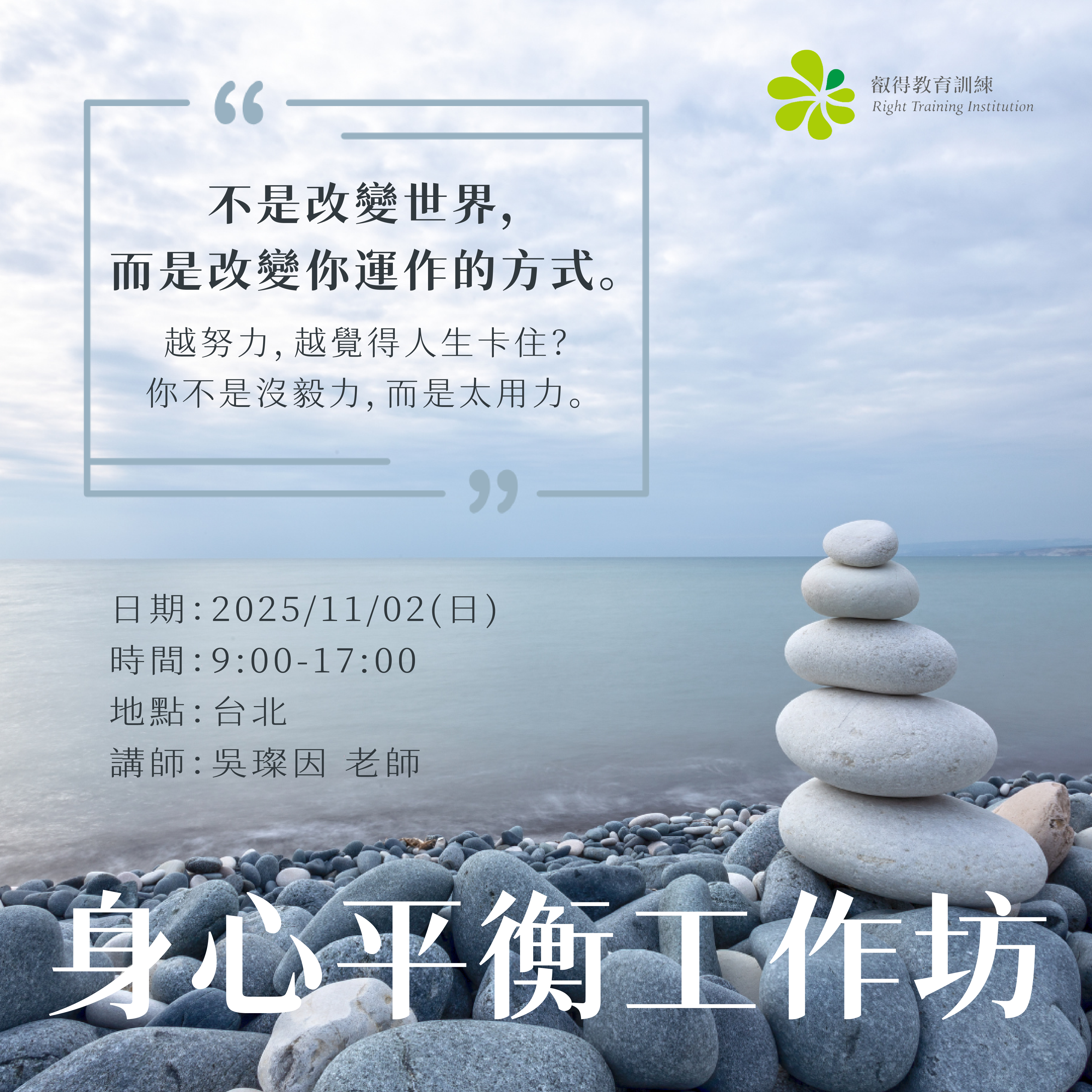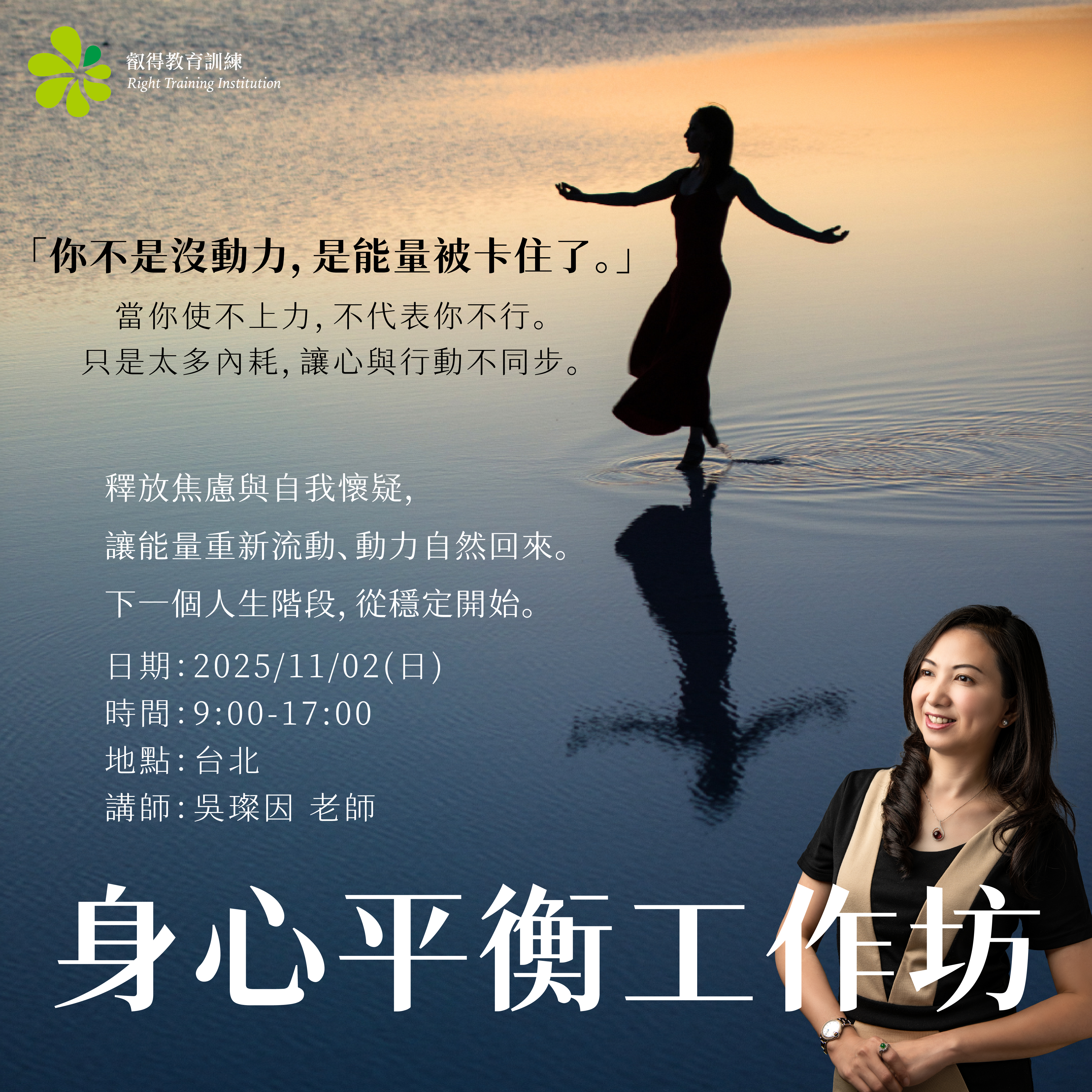 學員敲碗好久,璨因老師終於開課啦!【身心平衡工作坊】暖心回歸 你是不是也常常這樣 為了別人拼命付出,卻忘了自己 明明很累,還是說「我沒事」 一件小事就爆炸,心累又自責其實你沒有問題,只是太久沒好好照顧自己而已。這堂課,讓你用 NLP 教練技術 放下壓力 聽見自己 找回內在的穩定與平衡【課程資訊】-台北 日期:2025/11/02(日) 地點:台北IEAT上課時間|09:00~17:00名額有限|額滿即止 限時超值優惠|只要 NT$6,999 元方案A:一人早鳥$3,600 元方案B:兩人同行$4,200 元方案C:三人同行$4,800 元報名連結https://bit.ly/42O5Pa3北部-工作坊揪團群https://line.me/ti/g/GYSFXdFrVN如有任何問題請聯繫客服LINE 巾筑 https://line.me/ti/p/sLXPPoOQ05 工作坊訊息 工作坊名稱 身心平衡工作坊 工作坊時間 2025年11月2日 09:00 ~ 2025年11月2日 17:30 報名訊息 姓名 性別 - Select - 女 男 年齡 手機 電子郵件 居住地 - Select - 臺南市 臺北市 新北市 桃園市 臺中市 高雄市 基隆市 新竹市 嘉義市 新竹縣 苗栗縣 彰化縣 南投縣 雲林縣 嘉義縣 屏東縣 宜蘭縣 花蓮縣 臺東縣 澎湖縣 金門縣 連江縣 職業 職業的描述是讓 吳璨因 老師更能理解來的學員的背景,讓老師的課程可以更精準的深入學員的需求! 報名選項 - Select - 一人刷卡 3,600 元 二人同行 刷卡 4,200 元 三人同行 刷卡 4,800 元 同行者姓名和電話 推薦人 從哪裡知道這個課程? 璨因家族 學員(曾參加體驗營或工作坊) 朋友介紹 FB文章 FB廣告 Line分享 站內連結 電子郵件 其他… Enter other… 我已閱讀並同意此 報名條款. 報名注意事項: 本課程主辦單位有更改活動時間地點及講師之權力,如有異動將以『電話』、『簡訊』或『Email』通知。本人同意並了解,取消課程將收取手續費,手續費以課程『優惠價格』計算。一旦取消課程將收取優惠價格20%為手續費,或可於 29 天前轉讓他人同期課程。本課程開課 29 天前取消:將收取優惠價格20%為手續費。本課程開課前 15 ~ 28 天內取消:將收取優惠價格30%為手續費。本課程開課前 8 ~ 14 天內取消:將收取優惠價格40%為手續費。本課程開課前 1 ~ 7 天內取消:無法退費,無法延期,視同放棄課程資格。本課程開課當日取消:無法退費,無法延期,視同放棄課程資格。若已享有以下權利者,均視為開課,無法退費:(1)加入璨因家族Facebook私密社團、(2)開通璨因教練學院官網權限、(3)參加璨因家族直播、(4)參加教練/催眠練習會、(5)申請課程延期。本課程一經報名,若無確定上課日期,須於報名日期一年內完成課程,逾期視同放棄課程資格。若申請璨因家族(NLP清晰教練班)退費,退費金額將扣除因璨因家族身份享有之優惠金額。如遇不可抗力(颱風、地震、停電等)或行政命令宣布停課,致使課程無法如期開課,只可延期,無法退費。收受學員相關事宜,本課程主辦單位保有最終決定權,並得不定期修改本條款。手續費如有條件重複適用者,以收取較低金額為準。報名視同同意以上注意事項 我已詳閱 個人資料告知事項 並授權 叡得教育訓練 使用我的個人資料。 1. 叡得教育訓練(以下稱本機構)為聯繫及辦理課程、活動等相關業務需求,必須取得您的個人資料,在個人資料保護法及相關法令之規範下,本機構將依法蒐集、處理及使用您的個人資料。2. 本次蒐集與使用您的個人資料如報名表內文所列,包含姓名、出生年月日、年齡、性別、照片、國民身份證(護照)字號、就讀學校科系/班別、通訊處、連絡電話、緊急聯絡人/方式、E-MAIL、溝通方式、參加原因等得以直接或間接識別您個人之資料。3. 您同意本機構因招募所需,以您所提供的個人資料確認您的身份、與您進行聯絡;並同意本機構於您提供個資後繼續處理及使用您的個人資料。4. 您可依個人資料保護法,就您的個人資料向本機構:(1)請求查詢或閱覽、(2)繪製複製本、(3)請求補充或更正、(4)請求停止蒐集、處理及利用或(5)請求刪除,但因本機構執行職務或業務所必需者及受及他法律所規範者,本機構得拒絕之;若因您行使上述權利導致權益受損時,本機構不負相關賠償責任。5. 你可自由選擇是否提供本機構您的個人資料,但若您所提供之個人資料,經檢舉或本機構發現不足以確認您的身份真實性或偽造文書或其他個人資料冒用、濫用、資料不實等情形,本機構有權停止您的報名資格等相關權利,若有不便之處敬請見諒。6. 本同意書如有未盡事宜,依個人資料保護法或其他相關法規之規定辦理。您瞭解此同意書符合個人資料保護法及相關法規之要求,具有同意本教育訓練蒐集、處理及使用您的個人資料之效果。 CAPTCHA This question is for testing whether or not you are a human visitor and to prevent automated spam submissions.
